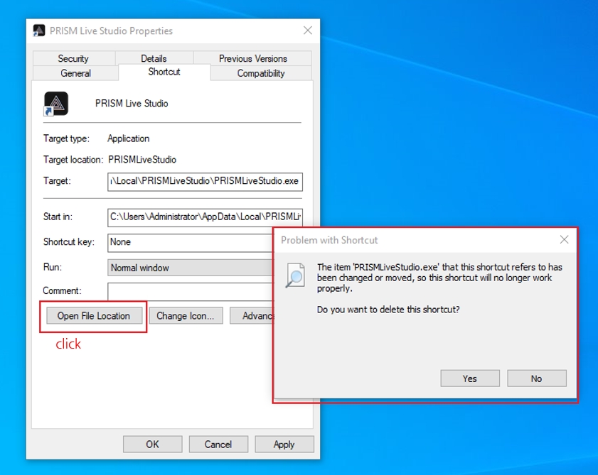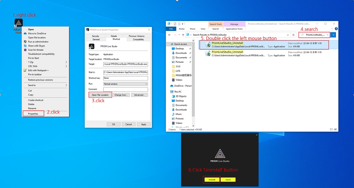 Right-click the PRISM app icon on the desktop and click Open file location to navigate to the installation folder. In the folder, search for PrismLiveStudio_Uninstall.exe in the folder and double-click it to start the uninstallation process.