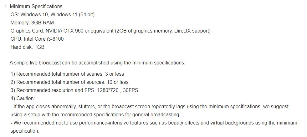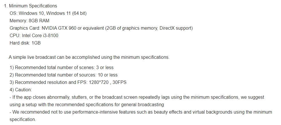 When live streaming on a low-spec PC, there is a risk of app crashes, stuttering, or frequent screen interruptions. To ensure stable transmission, consider the following tips when using the app on a low-spec PC: