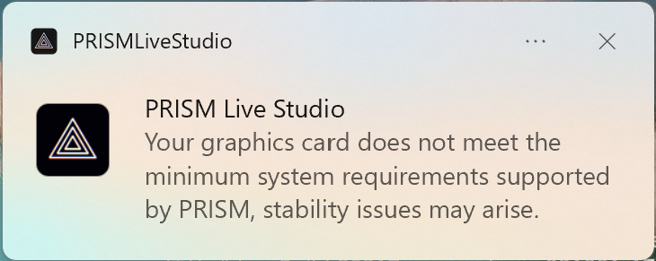 When launching PRISM Live Studio, the app inspects whether your PC meets the required specifications. If you are using a low-spec PC, a notification message will appear in the lower right corner of the screen.