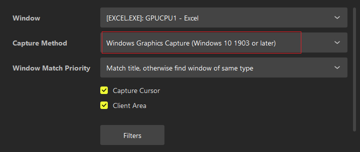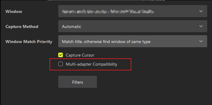 Set the capture method to ‘Windows Graphics Capture (Windows 10 1903 or later)’. This option is available in the Window Capture source properties window.