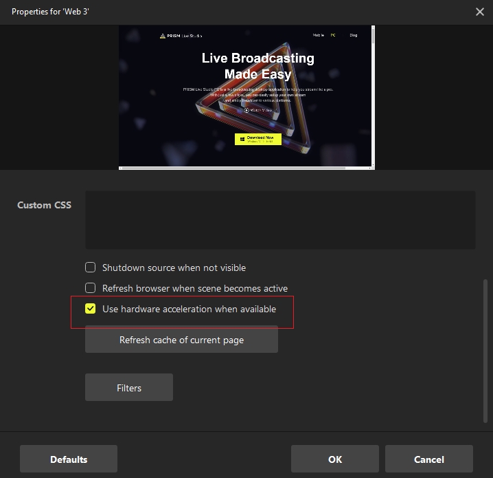 The Browser source enables you to embed live content from web pages into your broadcast. However, adding multiple browser sources can significantly increase GPU usage, even if the ‘Use hardware acceleration when available’ option is disabled.
