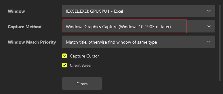 • Windows 10 (1903 and later) capture uses less GPU but higher CPU.
