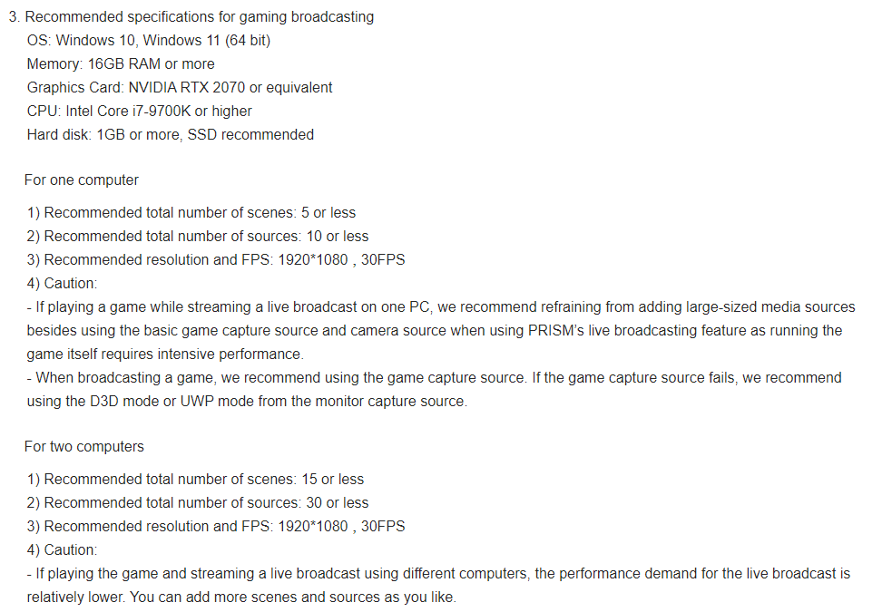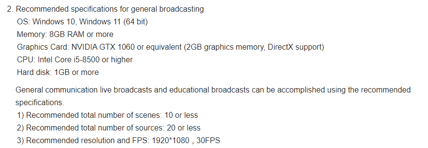 For recommended system requirements for stable transmission, check the image below or visit Help > Install and Start > System requirements.