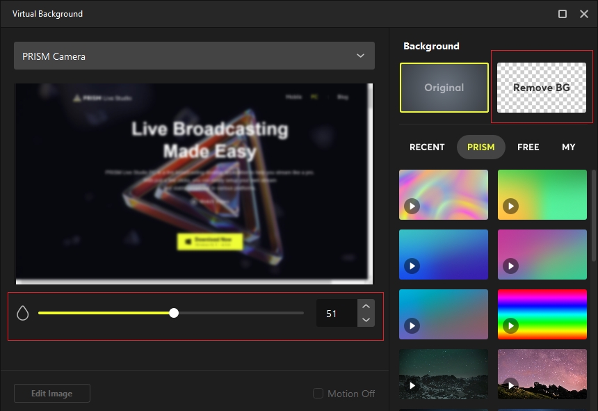 Background Templates allow you to add motion-based backgrounds to your scene. The MY tab in the source properties window lets you upload your own images for virtual backgrounds.