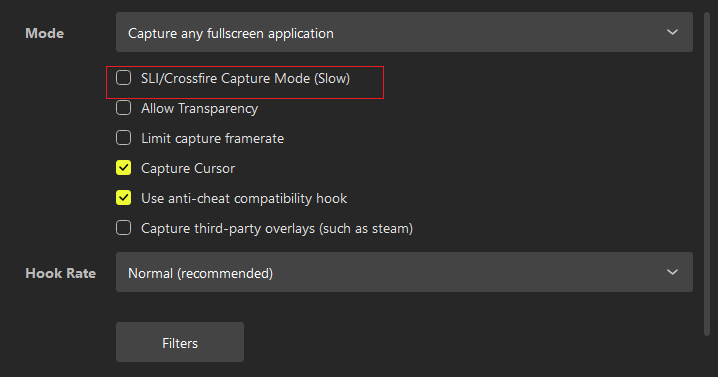 Disable the ‘SLI/Crossfire Capture Mode (Slow)’ option if you have only one graphics card. This option is found in the Game Capture source properties window.