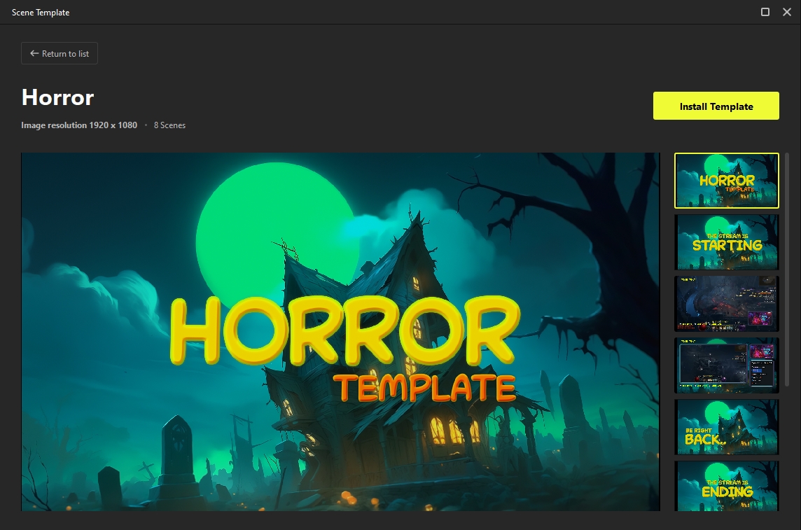 A list of available Scene Templates will appear as shown in the image below. When you select a scene, you can view a detailed preview of that template. Click the Install Template button to apply a template to your scene.