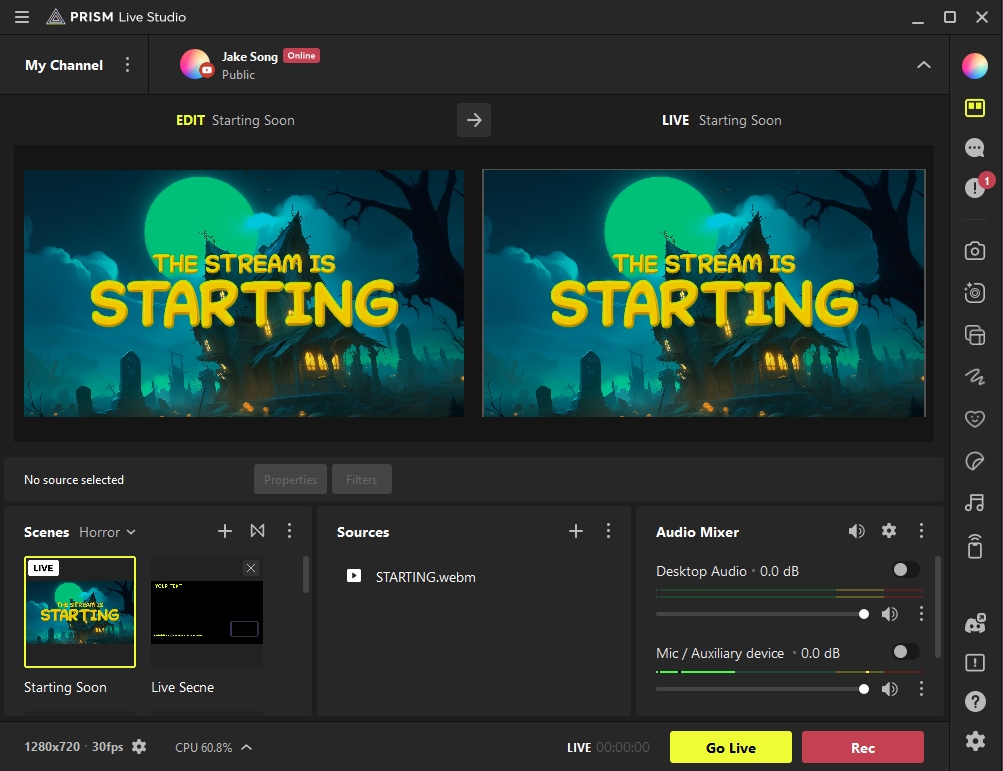 After installing a template, its scenes and sources will be immediately applied to the PRISM app.