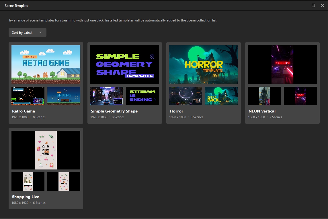 You can easily customize your live broadcast screen by using various scene templates, without having to configure separate scene settings. You can find the Scene Template icon in the tooltip on the right, or you can add a Scene Template from the Scene Set Management window.