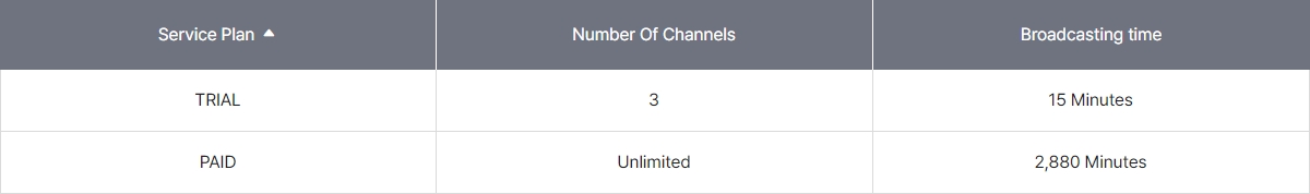 A TRIAL plan is applied when the service is created. The TRIAL plan is limited to a maximum streaming time of 15 minutes and up to 3 active channels.