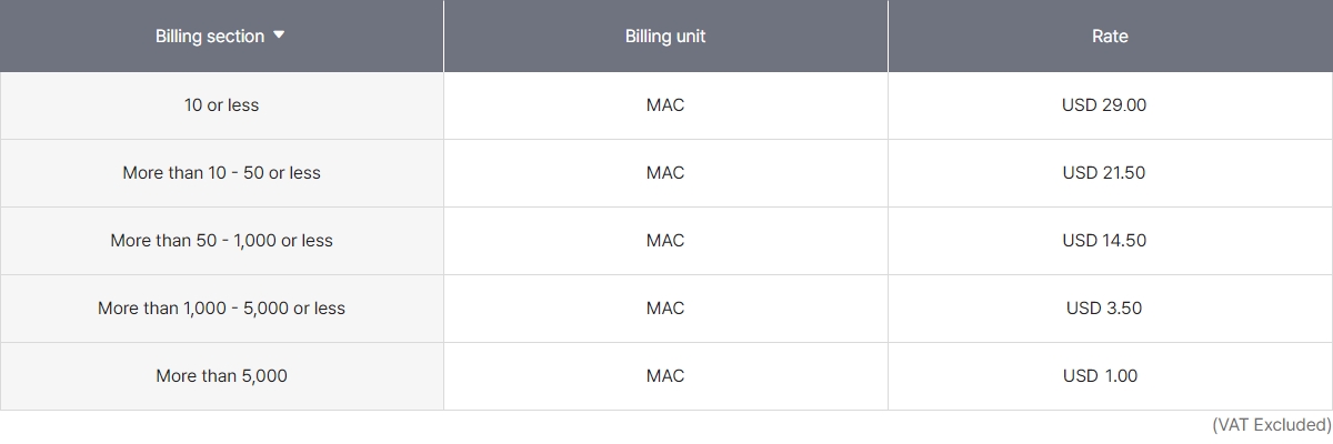 For example, let’s say you have 400 MACs. The total monthly bill is: . 0 – 10 tier: 10 MACs * 29.00 USD = 290 USD . 11 – 50 tier: 40 MACs * 21.50 USD = 860 USD . 51 – 1,000 tier: 350 MACs * 14.50 USD = 5,075 USD Total = 290 USD + 860 USD + 5,075 USD = 6,225 USD