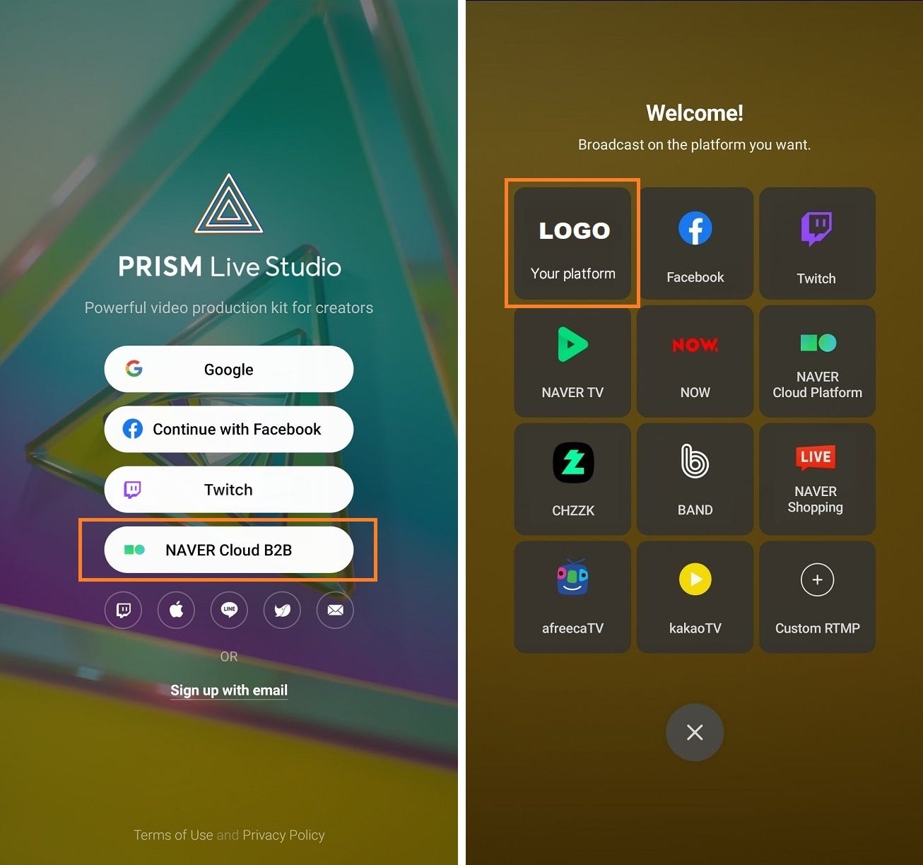 However, for the B2B product, users can join and log in to the PRISM app by clicking the NAVER Cloud B2B button shown in the image. When users click the NAVER Cloud B2B button, they will sign up and log in to the PRISM app with their corporate live service account.
