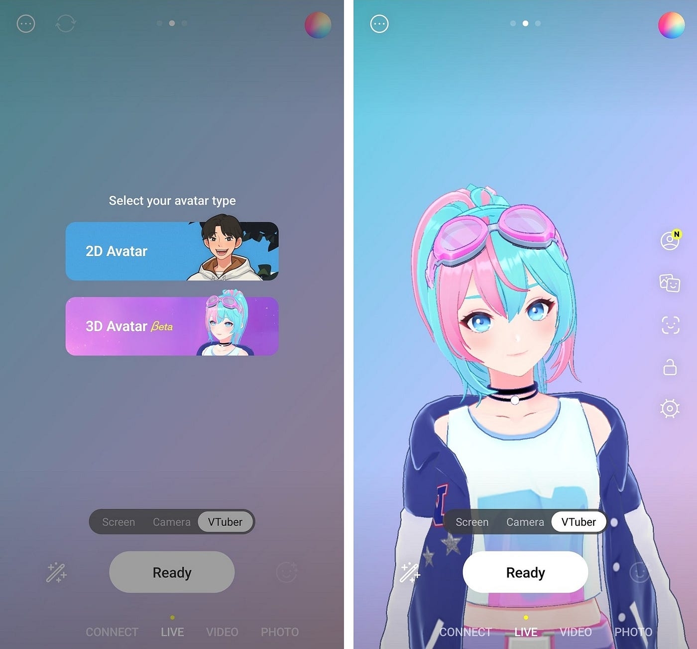 The PRISM app supports three modes: Screen Live (ScreenCast), Camera Live, and VTuber mode. Select VTuber from the list of live types, which you can see in the center of the image on the left below. Here, we’ll use a VRM model-based 3D avatar, so make sure to select a 3D Avatar from the avatar types.