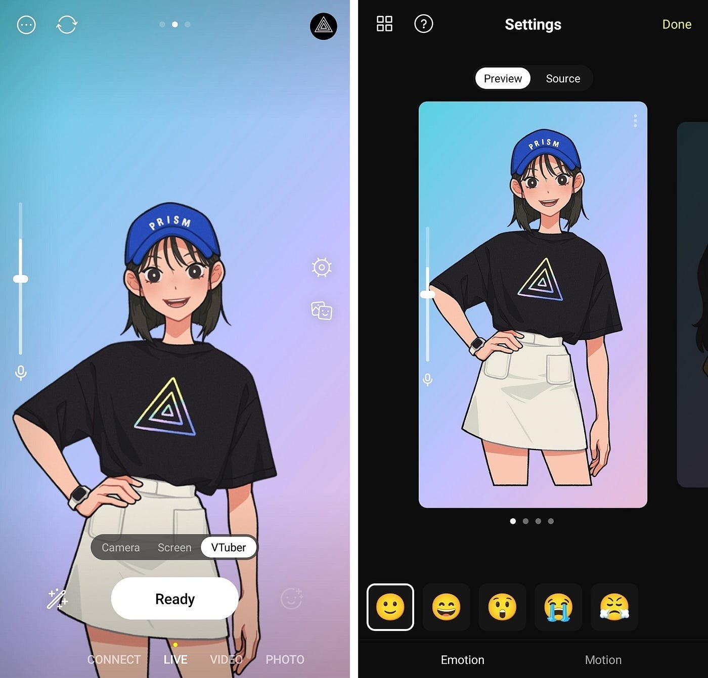 When you look at the middle part of the picture on the left, you can see the Settings button, and once you click that button, you can enter the VTuber setting screen. On the VTuber setting screen, you can check the 5 default characters provided by the PRISM app by swiping.