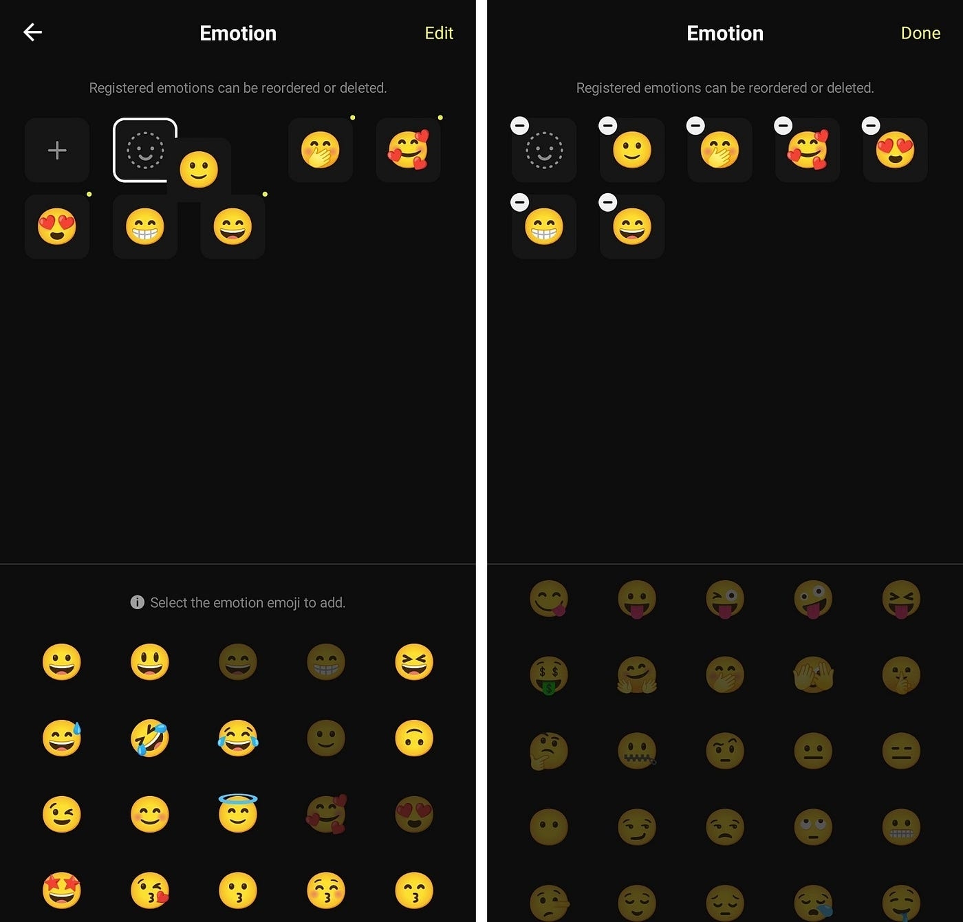 Here you can delete previously registered emotions or adjust the order in which emotions are placed. When all adjustments are complete, click the Done button at the top right to complete the application.