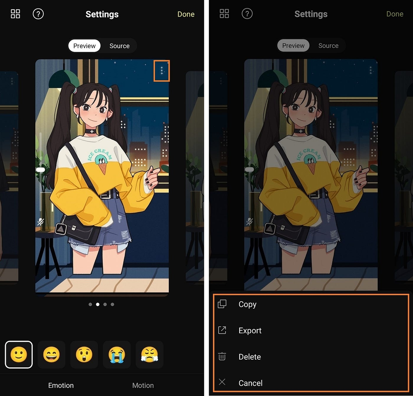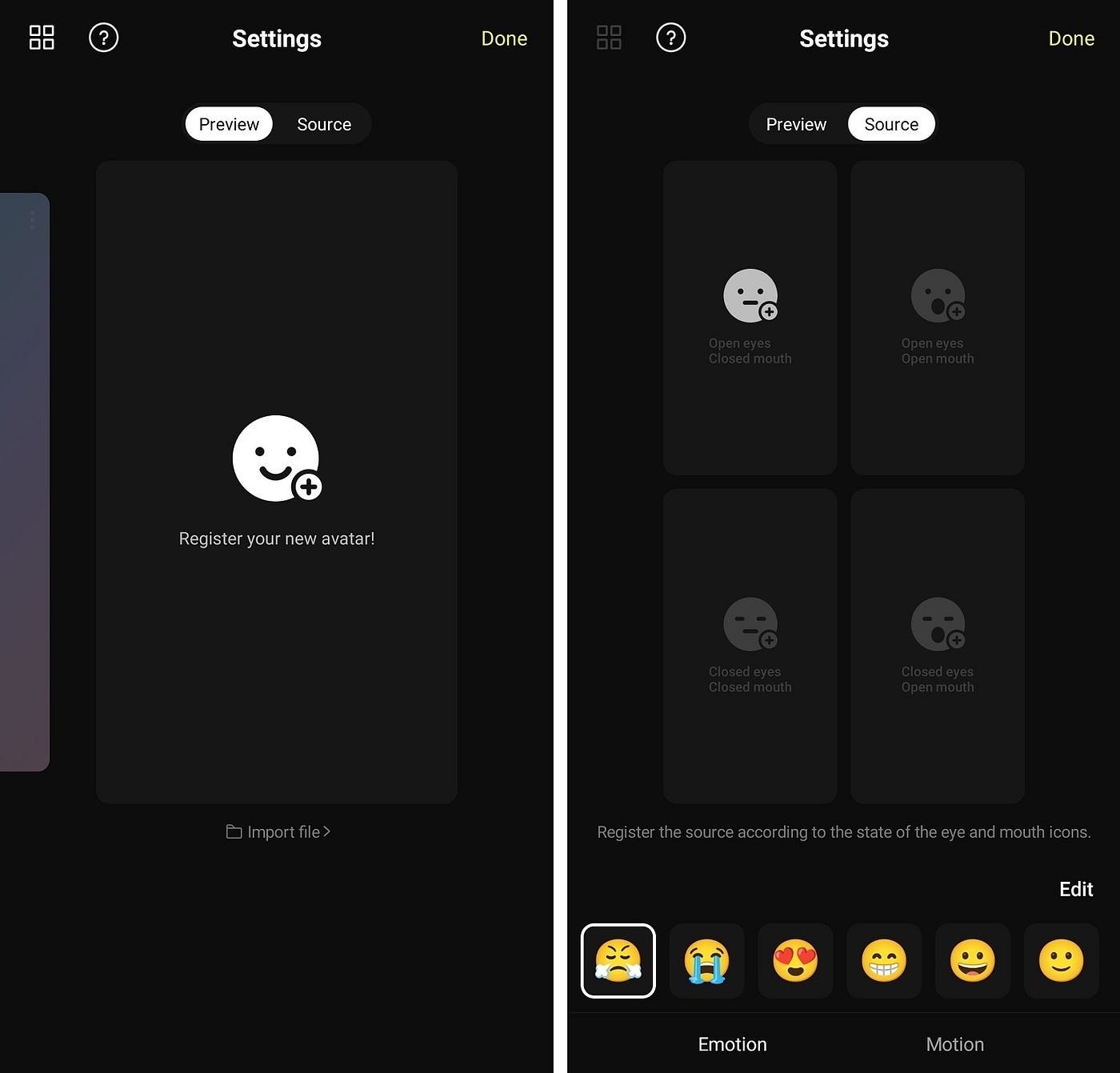 At the top of the card, Preview and Source tabs are located, and you can register image sets for each emotion guide in the Source tab. This image set is for changing the shape of the eyes and mouth, and it is recommended to prepare one set consisting of 4 images as shown below: