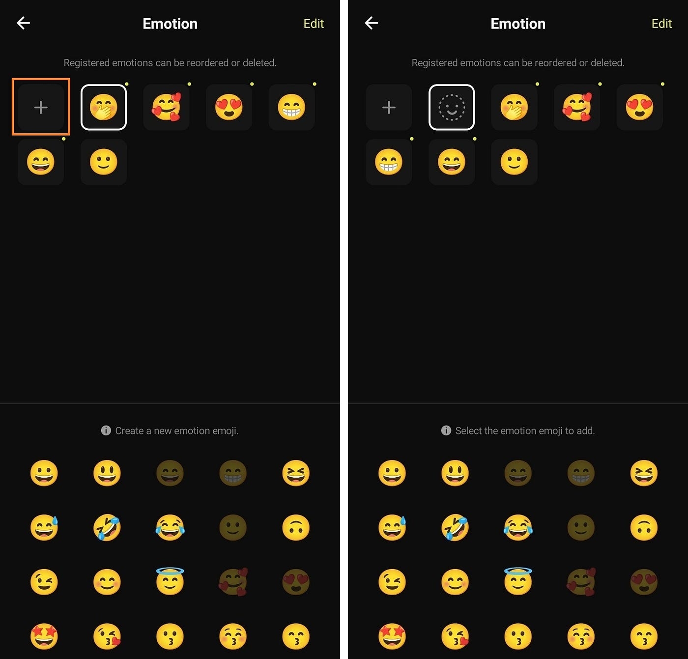 So, click the plus button to see a new emotion slot appear, then select and add a suitable emotion from the emotion emoji list at the bottom. You can see that an emoji has been added that looks greyed out.