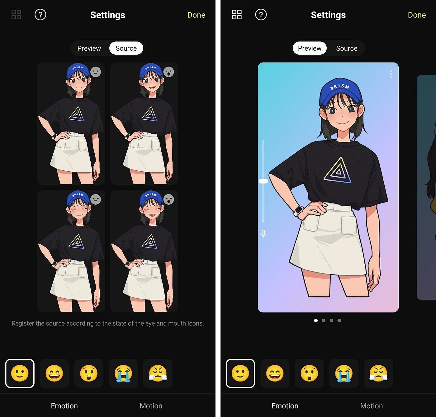 You can give your character repetitive movements through motion features that can be applied to each emotion. And the PRISM app has a total of five forms of motion. And you can even apply a different motion for when the mouth is open and closed.